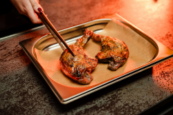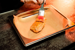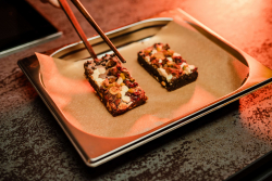 Erwärmen Sie die Schokoladenbrownies kurz in der Restwärme des Ofens, nachdem Sie die Keulen herausgenommen haben. Geben Sie zum Schluss etwas warmes Orangen-Toffee über die Brownies, und sie sind bereit zum Servieren.