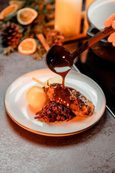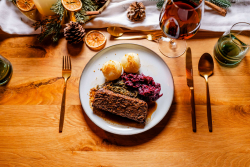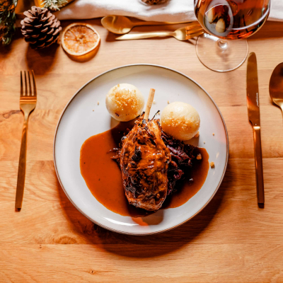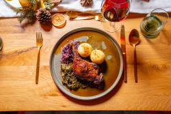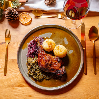 - Hauptspeise: Gebackene Entenkeule aus dem Rohr mit würzigem Rotkraut, Grünkohl und kräftiger Orangen-Jus, dazu Kartoffelklöße mit brauner Butter oder als vegane Hauptspeise gratinierte Süßkartoffel mit gerösteten Haselnüssen auf Kichererbsenragout